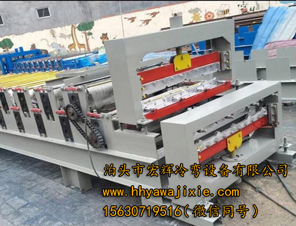 (2)為了滿意在有限的場地面積上成型兩個斷面的需要,能迅速地變換產(chǎn)品,壓瓦機雙層軋機(雙層彩鋼瓦成型機,雙層一體設(shè)備)也被設(shè)計制造出來,這種雙層彩鋼瓦成型機是在高或低機架之間變換,生產(chǎn)一種輪廓的彩鋼板安裝在低機架上,生產(chǎn)另一種板型的軋輥安裝在高機架上面,生產(chǎn)線有一個開卷機,一個割斷壓力機,如果彩板喂入低層軋輥,成型一個板型(如平房用披又疊板)如料卷喂入高層的軋輥,而成型另一個斷面(層面板)。